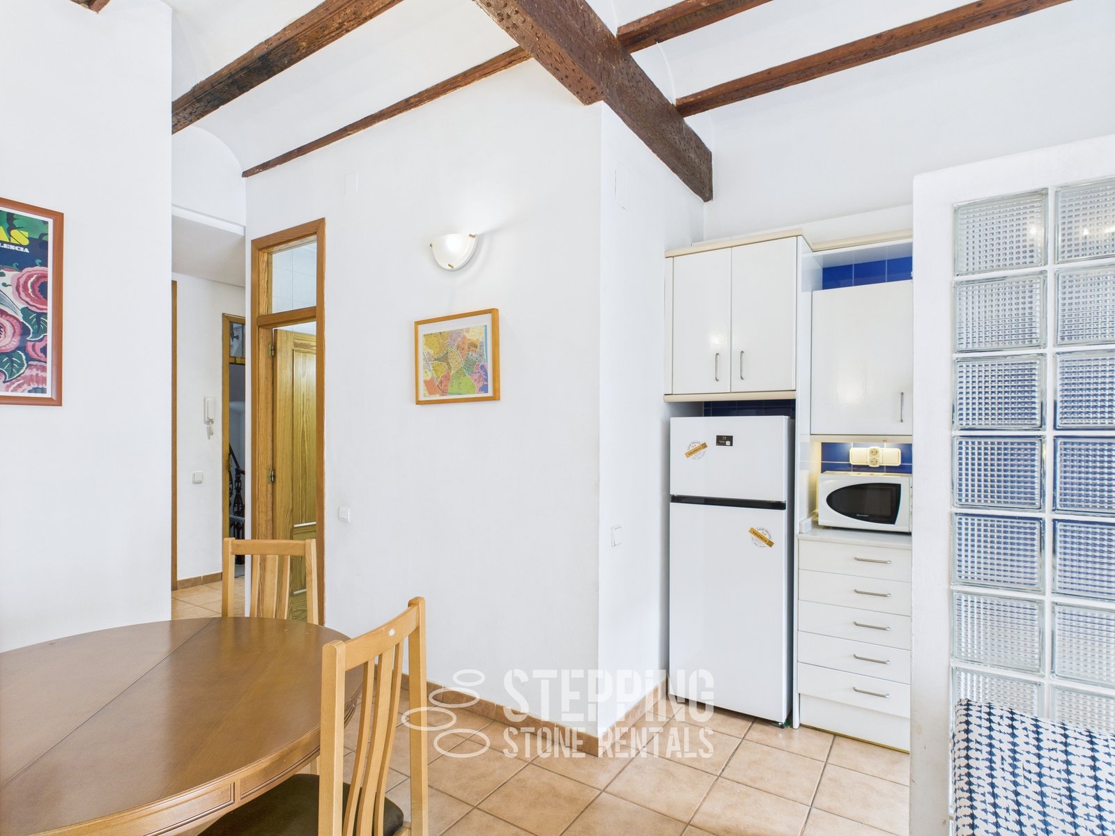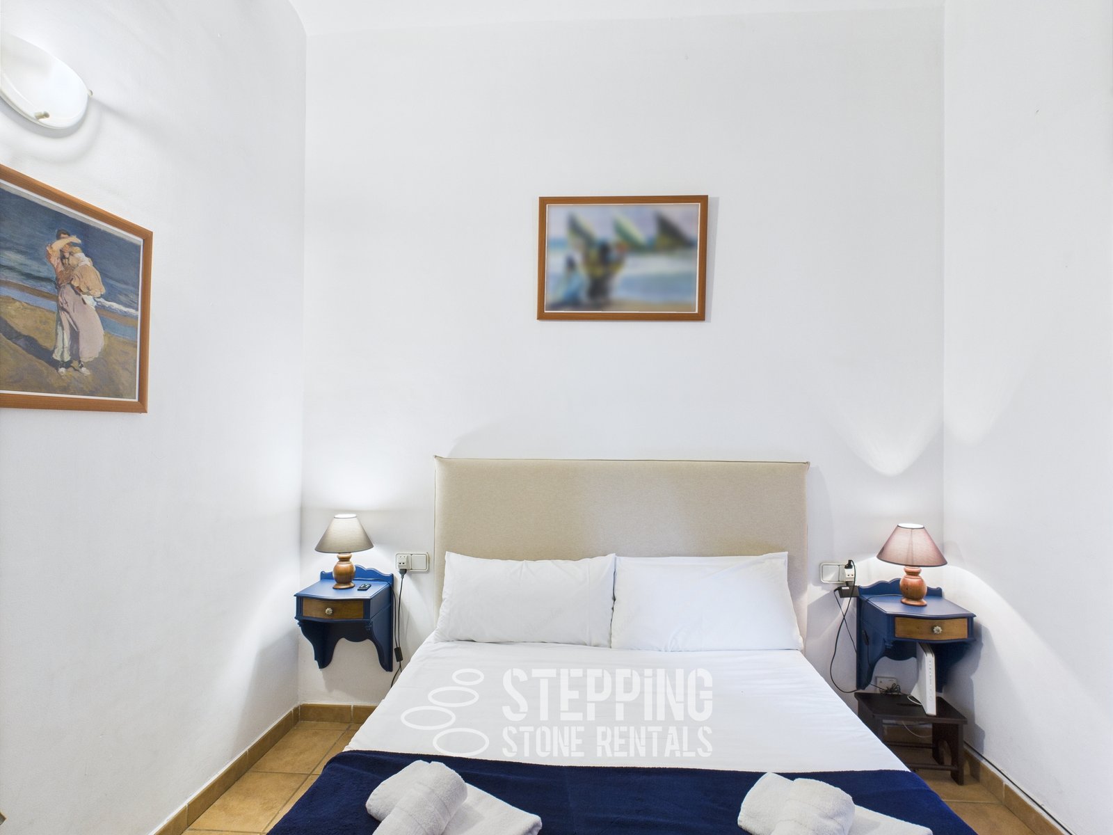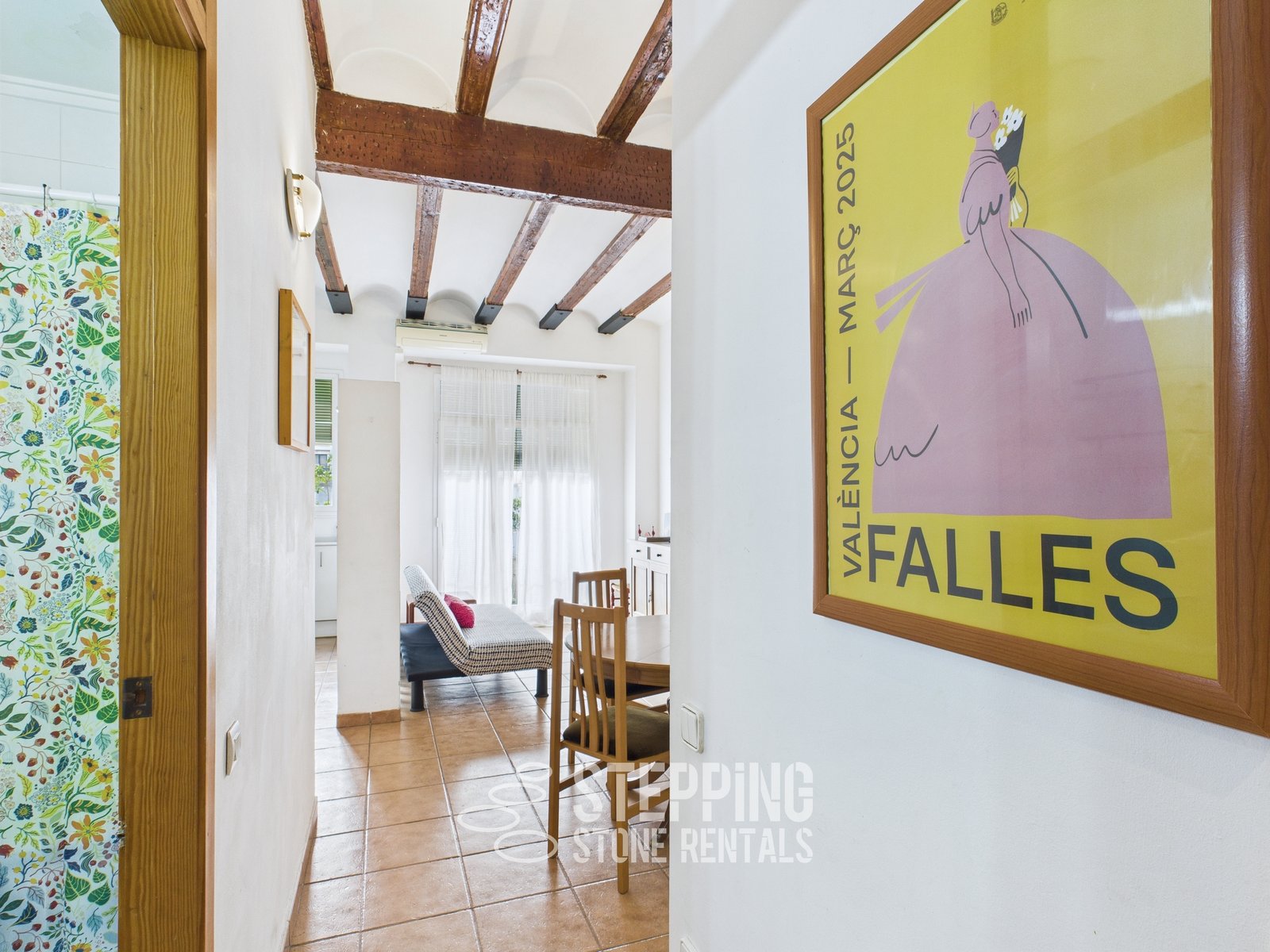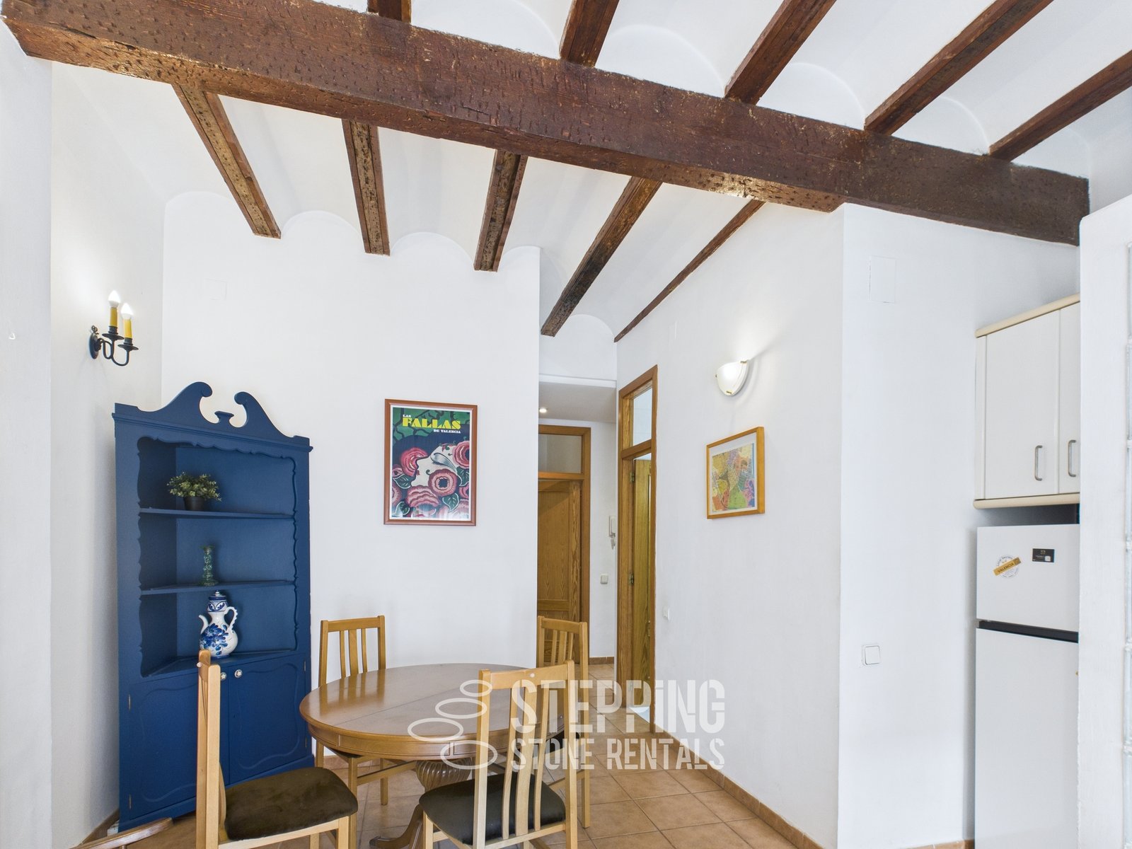The apartment has cottage-style furnishings with traditional Valencian touches. It is ideal for a couple or a family with a young child. It has A\C in the living room and WIFI throughout. Traditional style in great condition.