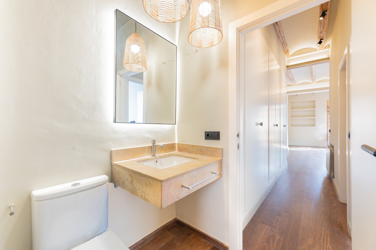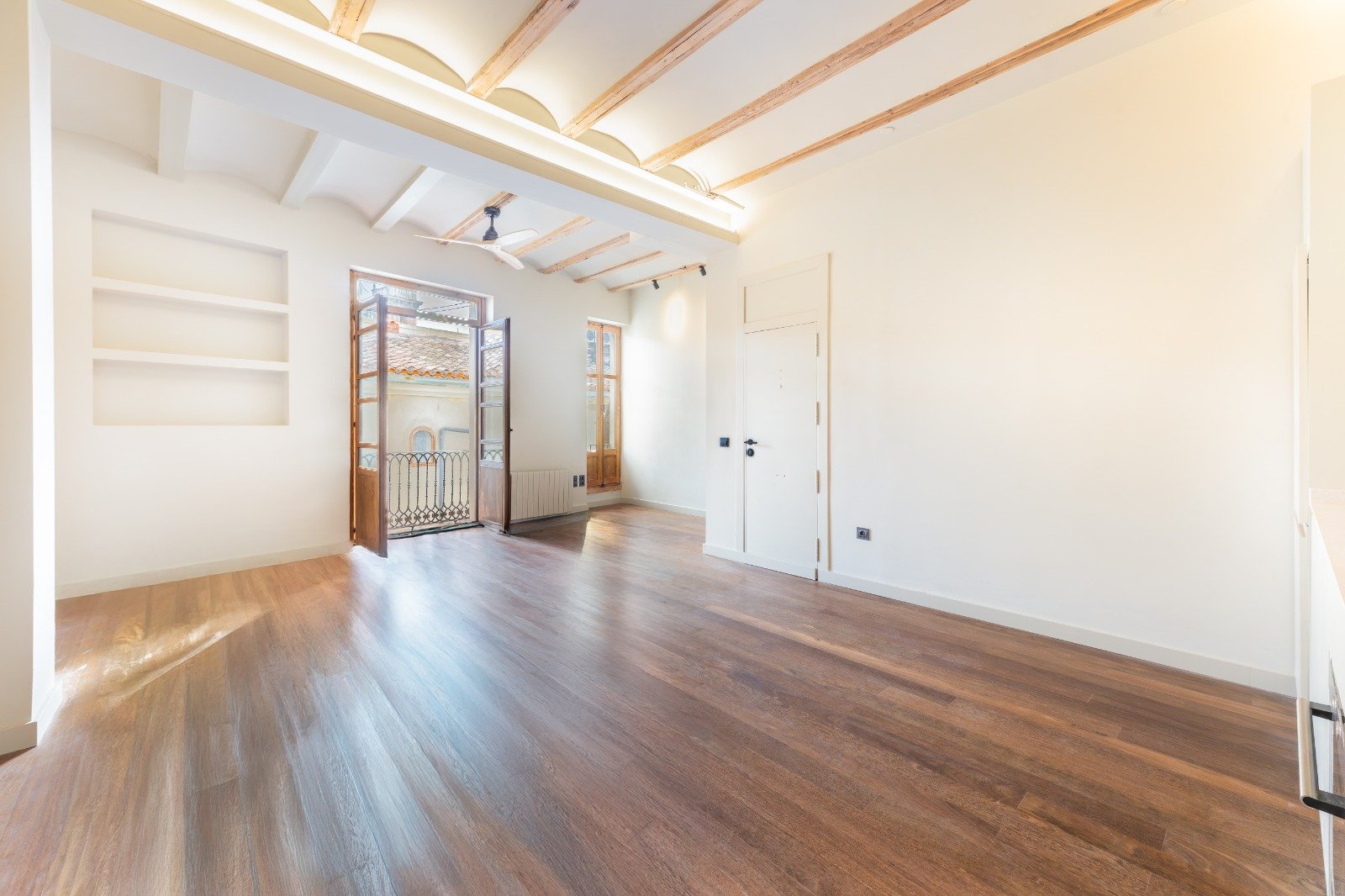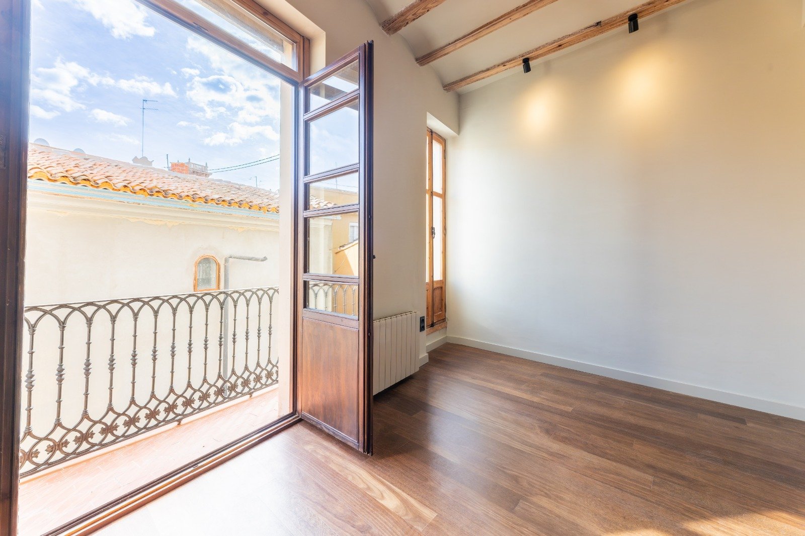 High wooden beam ceilings crown the space, while soft natural light fills each room, enhanced by the rare calm of a peaceful street in the heart of El Carmen.