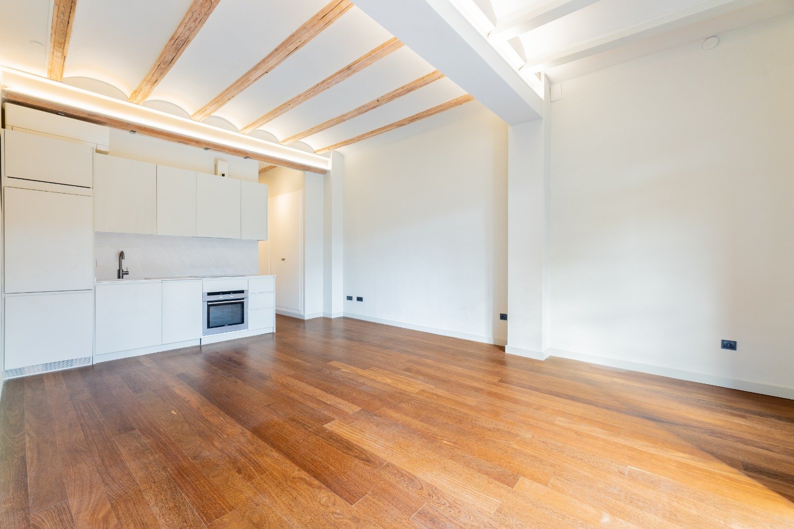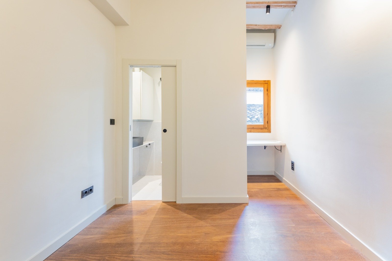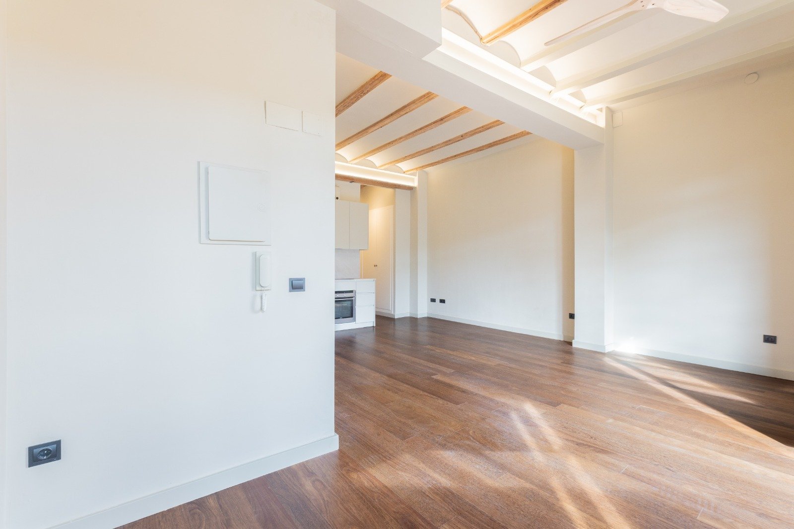 High wooden beam ceilings crown the space, while soft natural light fills each room, enhanced by the rare calm of a peaceful street in the heart of El Carmen.